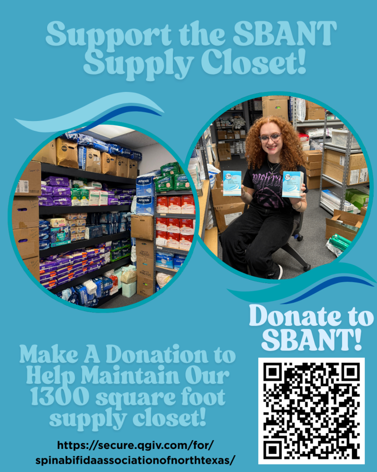 For our year-end Annual Appeal, we are asking for your help. Increased expenses, including rent and the cost of supplies are putting our Supply Closet in jeopardy of continuing at it’s current size and location. Having over 1300 square feet in our office dedicated to providing incontinence supplies, DME supplies and equipment has been a blessing to many families and individuals with Spina Bifida.