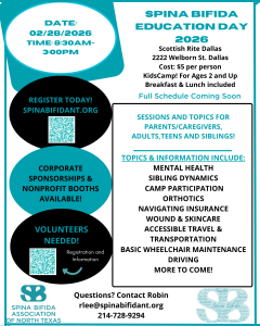 SBANT supports and connects communities across the North Texas area, including communities in East, Central and West Texas. Established in 1973, SBANT works year-round to provide services, resources, outreach, education, referrals and programs to support our families and adults with Spina Bifida fulfill our mission. Our goal is to raise awareness of Spina Bifida and to give children, families and adults the tools that they need to be advocates for themselves, independent and active individuals with Spina Bifida and to have a strong, supportive community.